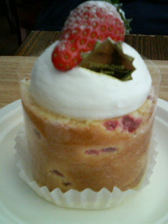 これは、見ての通り、苺ケーキ。スポンジに苺が入ってて、その上、真ん中にも苺が挿入されています。